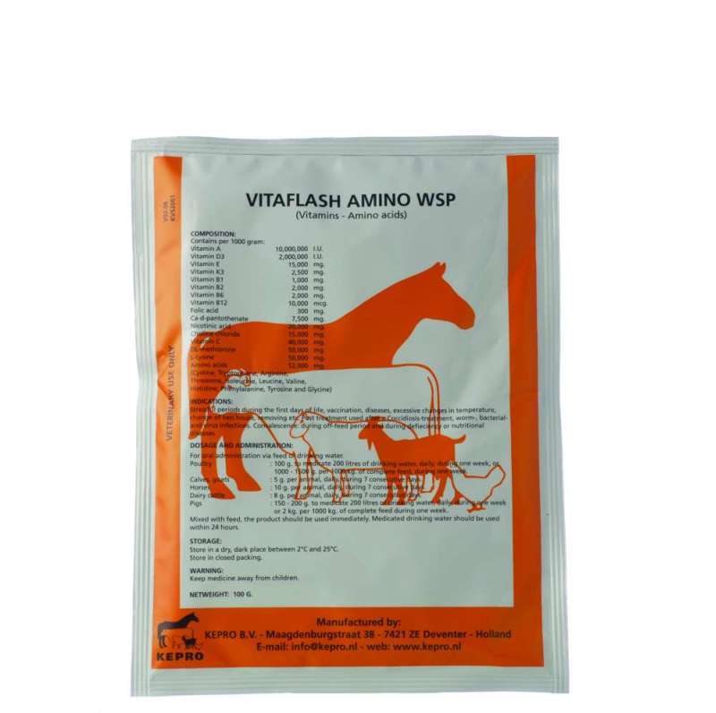 Vitaflash Amino WSP | 100g is a scientifically concentrated, stabilised powder of multivitamins with thirteen essential amino acids for use in drinking water. This facilitates the efficiency of the treatment because animals continue drinking even when they have lost appetite.